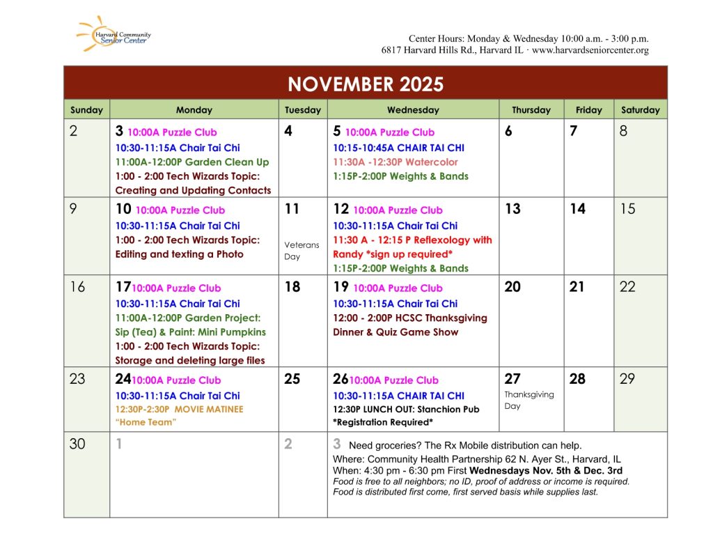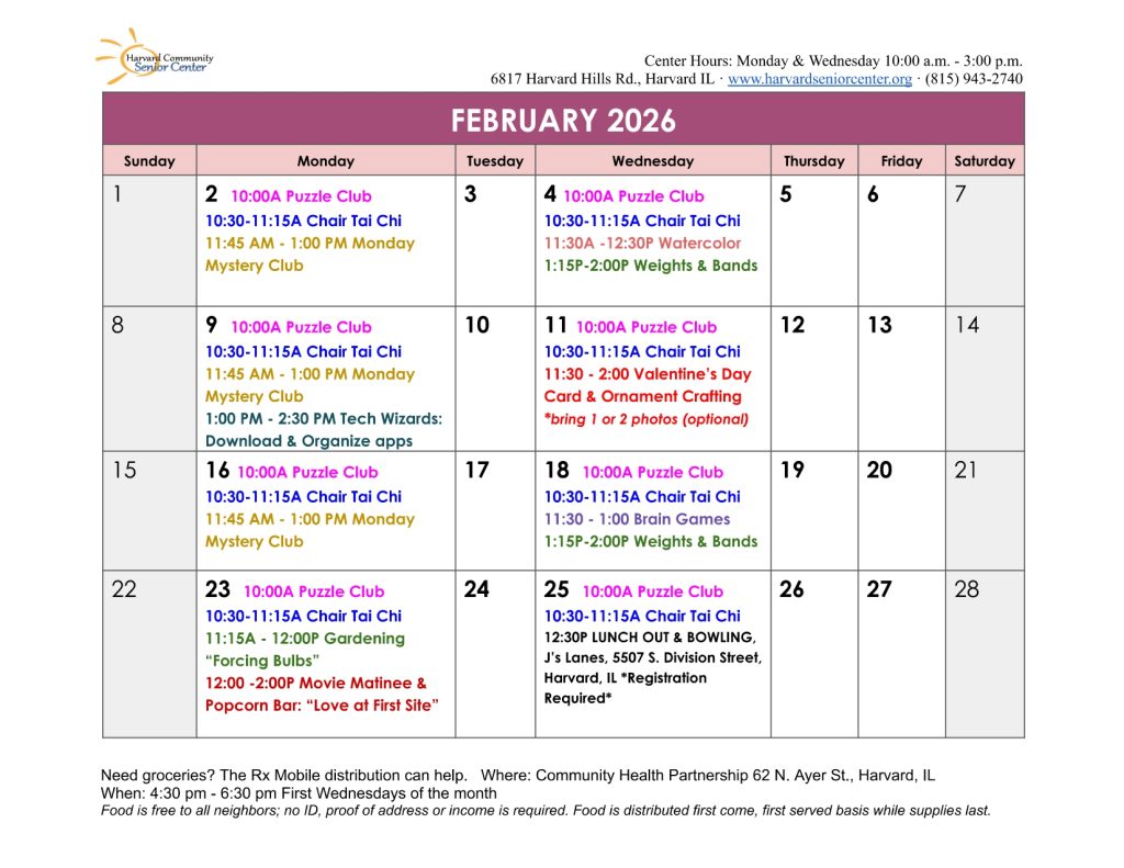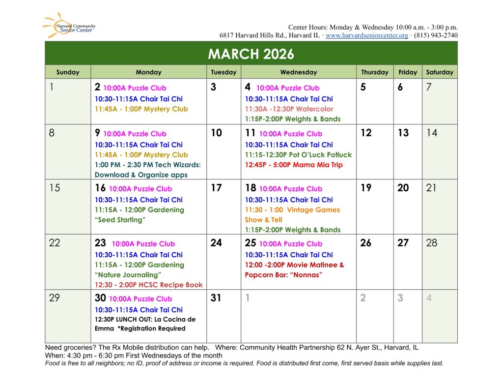 We offer a variety of activities every Monday and Wednesday from 10:00 a.m. to 3:00 p.m. at the Harvard Community Senior Center.