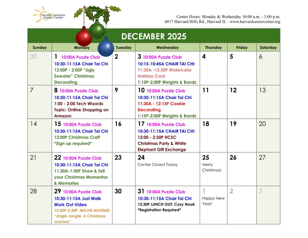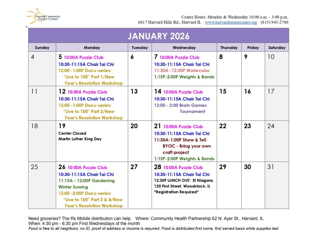 Unless otherwise indicated, all programs offered at HCSC are free. Registration may be done by calling the center at 815-943-2740 or by signing up in person during our normal center hours.